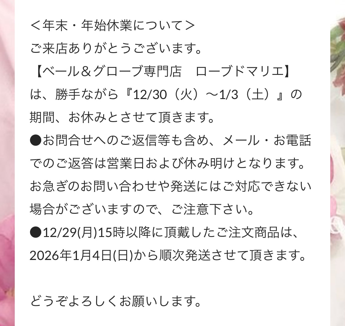 【ベール&グローブ専門店 ローブドマリエ】は、勝手ながら『12/30(火)~1/3(土)』の期間、お休みとさせて頂きます。