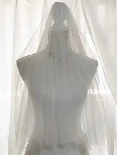 イタリア製チュールはキメが細かく、一般的なオフホワイトよりややアイボリーがかったお色目です。着用の際には拡がりますので、殆ど一般的なオフホワイトベールとの差は目立ちません